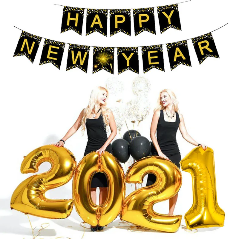 Happy new year 2020 celebration. 2021 happy new year balloons with golden and luxury style text effect. Happy new year 2021 balloons. And 4 style new year foil balloons, totally 40pcs. 2021 happy new year balloons set,2021 graduation balloons banner.